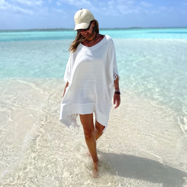 Bata quadrada em algodão sustentável BCI (Better Cotton Initiative), com franja em toda lateral e decote em V