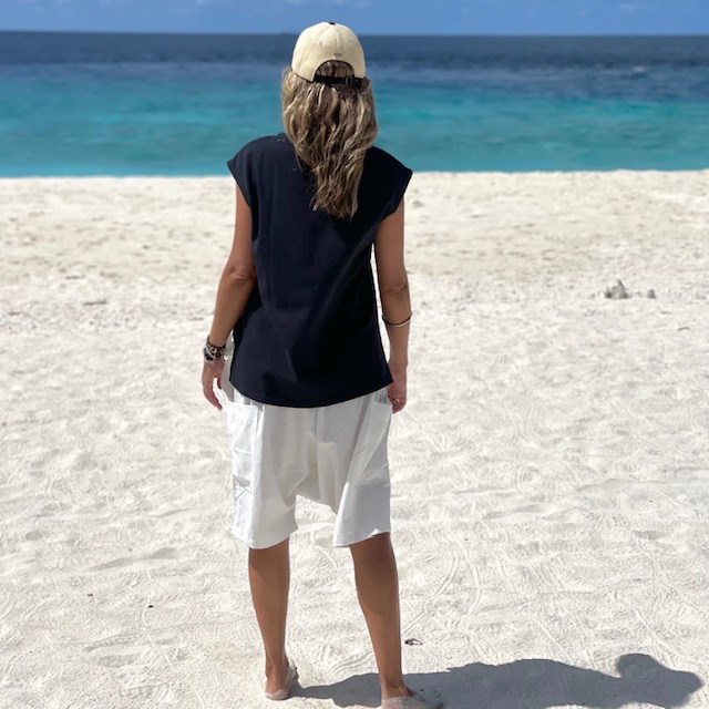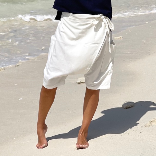 Bermuda unissex, com bolso embutido e cordão na cintura