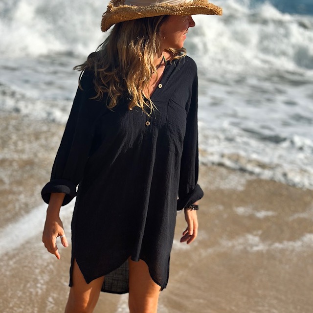 Camisão em gaze de algodão com 02 bolsos e botão em madeira