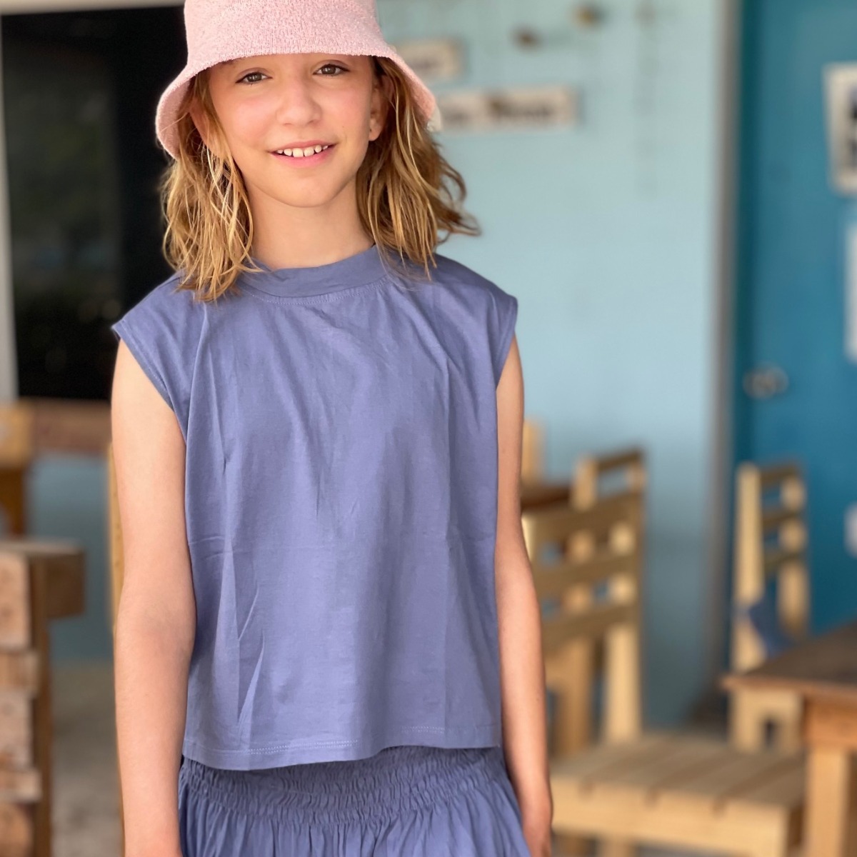 Camiseta quadrada sem manga com a parte de trás um pouco maior que a da frente