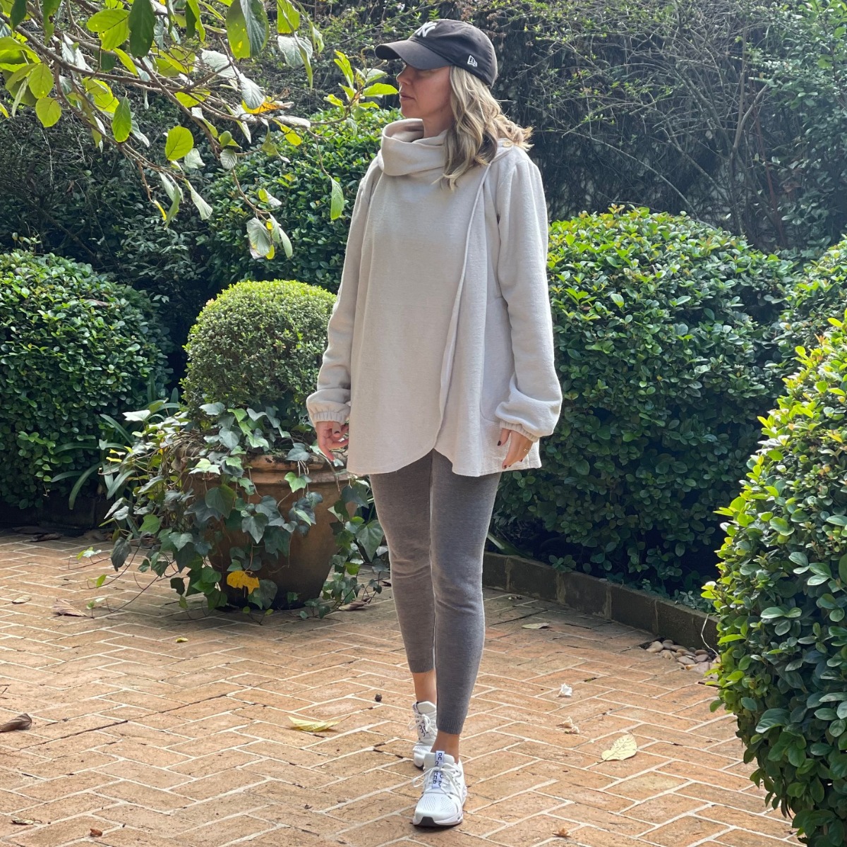 Casaco transpassado em tecido atoalhado por fora e felpado por dentro. Elástico nas mangas, botão em madeira para fechamento no pescoço, capuz e 2 bolsos laterais